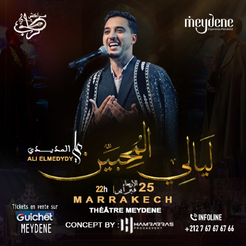 Display map🌙✨ ليالي المحبين – مراكش ✨🌙 في أجواء روحانية مميزة، ندعوكم لحضور سهرة ليالي المحبين ضمن جولة رمضان الفنية 📍 المكان: Théâtre Meyden – مراكش 🕰️25 مارس: الساعة 22:00 سهرة روحانية سامية تجمع بين الذكر، الإنشاد، والمحبة مع الفنان المتألق Ali El Medydy ✨ لحظة صفاء… إحساس… وروحانية لا تُنسى