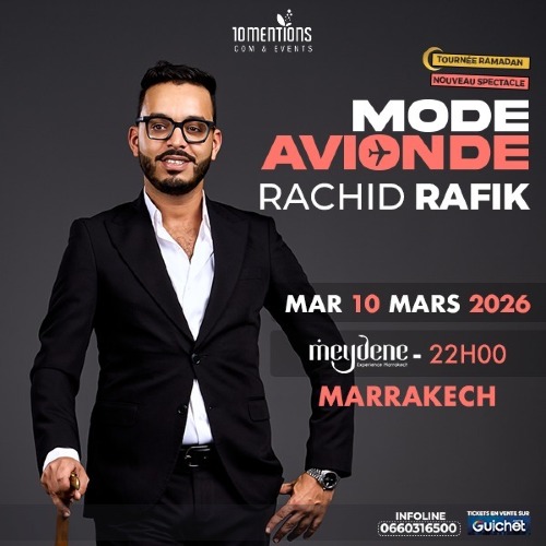 Afficher le planSuite à la forte demande du public, une deuxième date du spectacle MODE AVIONDE de Rachid Rafik est officiellement ajoutée à Marrakech, dans le cadre de sa tournée et pendant le mois de Ramadan Après le succès de la première date, l’humoriste revient pour une nouvelle soirée pleine de rires et d’énergie. Ne ratez pas cette occasion de vivre (ou revivre) l’expérience MODE AVIONDE.