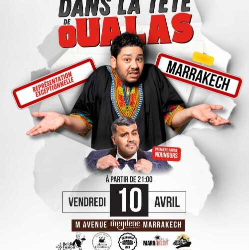 Afficher le planDans la tête de Oualas – Oualas en spectacle à Marrakech Préparez-vous à une soirée placée sous le signe de l’humour et de la dérision ! Oualas arrive à Marrakech avec son spectacle “Dans la tête de Oualas”, pour une représentation exceptionnelle à ne pas manquer. Avec son style unique, son énergie débordante et son regard décalé sur le quotidien, Oualas embarque le public dans un univers drôle et authentique, mêlant situations improbables, observations fines et éclats de rire garantis. Un show de stand-up rythmé et interactif, idéal pour les amateurs d’humour live, comedy shows et spectacles de stand-up à Marrakech, promettant une soirée conviviale et mémorable.